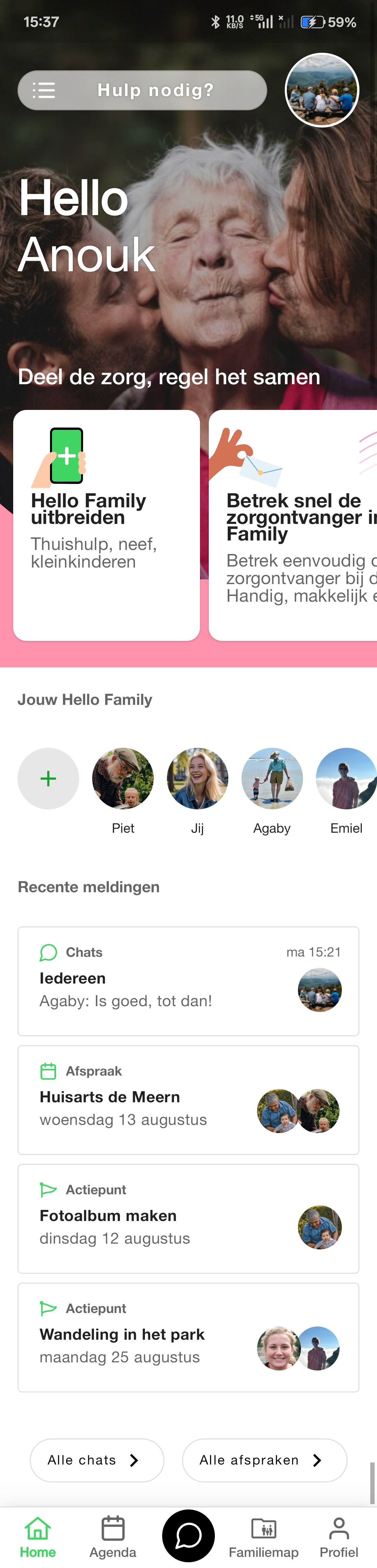 Hello 24/7 helpt je om samen te zorgen, zonder appgroepen of losse briefjes. Alles wat je nodig hebt op één plek. Probeer het nu zelf.